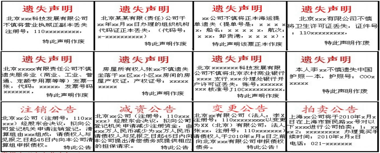 登报内容:营业执照、税务登记证、银行开户许可证、组织机构代码证、公章、财务章、发票丢失、外国人就业证、专家证、建筑资格证及各类证件遗失、挂失声明注销公告、减资公告、清算公告、拍卖公告、法院公告、催款公告、解除劳动合同公告、致歉公告、债权转让公告、维权公告、寻人启示广告及各类公告公示登报等信息发布。
