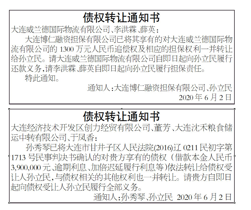 债权转让暨债务催收联合公告:xx资产管理有限公司与xxx有限公司债权转让暨债务催收联合公告 根据xxx资产管理有限公司与xxx天思科技有限公司达成的债权转让安排,xxx管理有限公司将对xxx业有限公司及其担保人享有的主债权(编号为DLY蓉201805210013《商业汇票承兑协议》项下债权)及担保合同项下的全部权利,依法转让给成xxx思科技有限公司。xx资产管理有限公司特公告通知各借款人及担保人。 -------------------------------------------------------------------------------------------------------- 说明: 1.广告需提前三个工作日订,要求加急刊登的广告,需加收全额广告费用的20%。 |